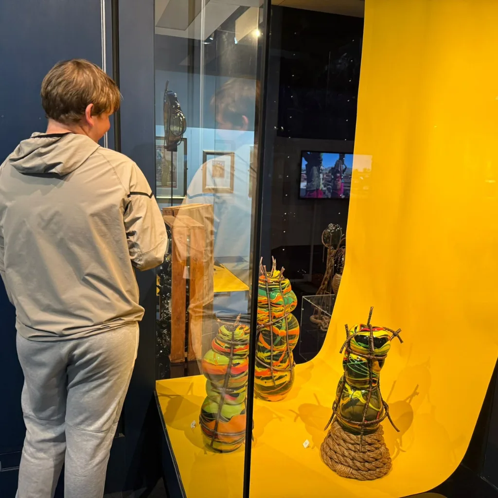 The highlight of the visit was experiencing the stunning display by celebrated Staffordshire ceramicist and glass artist Chris Day, titled Fragmented Truths. This exhibit, created as part of the Stoke-on-Trent Centenary Festival and the “I AM A WOMAN AND A SISTER” programme, showcases Day’s powerful works that respond to themes of postcoloniality, the legacies of slavery, and Black identity. His art combines glass, ceramics, and recycled materials to create sculptural pieces that provoke thought and dialogue about ongoing social issues.